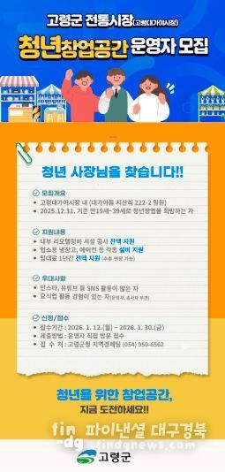 파이낸셜대구경북 기자 | 고령군은 이달 말 30일까지 고령대가야시장 내 청년창업공간에 신규 점포를 운영할 만19~39세 청년 창업가를 모집한다고 밝혔다.