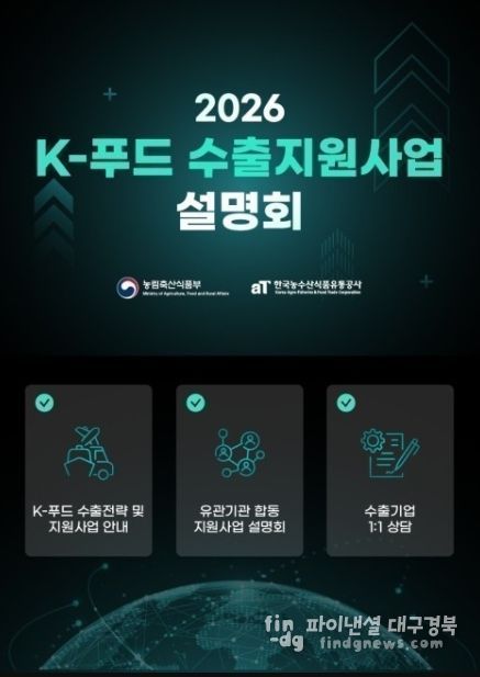 파이낸셜대구경북 기자 | 농림축산식품부는 K-푸드의 글로벌 진출 확대를 위해 전년보다 900억원 증가한 7,070억원 규모의 2026년 K-푸드 수출지원사업 설명회를 1월 23일 서울 과학기술컨벤션센터에서 개최한다고 밝혔다.
