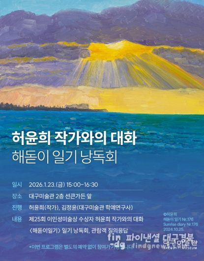 파이낸셜대구경북 김유신 기자 | 대구문화예술진흥원 대구미술관은 제25회 이인성미술상 수상자전 ‘허윤희: 가득찬 빔’의 전시 연계 프로그램으로 ‘허윤희 작가와의 대화: 해돋이 일기 낭독회’를 1월 23일 오후 3시, 대구미술관 2층 선큰가든에서 개최한다.