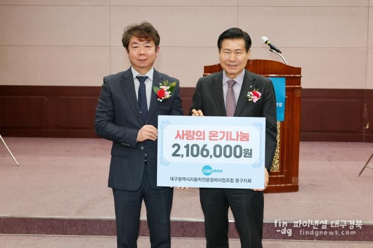 파이낸셜대구경북 김유신 기자 | 자동차전문정비사업조합(카포스) 중구지회는 지난 21일 열린 카포스 중구지회 신년회에서 사랑의 온기나눔 성금 210만 6천 원을 대구 중구청에 기탁했다.
