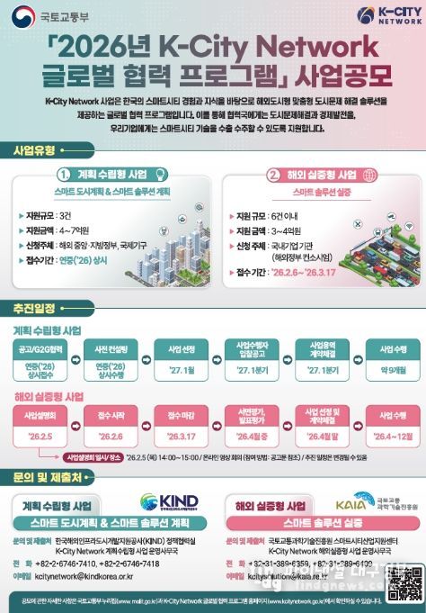 국토교통부 김연희 도시경제과장은 “K-City Network 글로벌 협력사업은 해외 도시와 함께 스마트도시를 기획하고 현장에서 실증까지 이어지는 대표적인 글로벌 협력 플랫폼”이라며, “2026년에는 AI 융합 스마트 솔루션의 해외 적용을 확대해 우리기업의 지속가능한 해외수출과 글로벌 경쟁력 강화를 적극 지원하겠다”고 밝혔다.