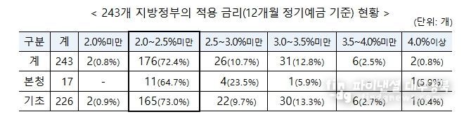 전국 243개 지방정부의 금고 이자율을 조사한 결과, 12개월 이상 정기예금 금리는 전국 평균 2.53%(공개 이자율 기준)로 집계됐다.