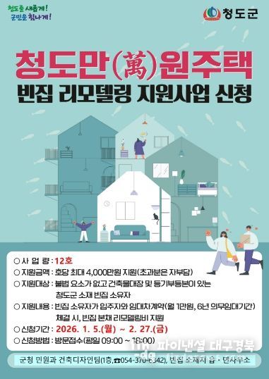파이낸셜대구경북 기자 | 청도군은 빈집 활용을 통한 주거 안정과 정주 여건 개선을 위해 2026년도 '청도만(萬)원주택사업'빈집 사업자에 대한 추가모집을 실시한다고 밝혔다.