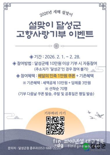 달성군은 2026년 첫 명절을 앞두고 고향사랑기부제 참여를 늘리고 기부 문화를 확산하기 위해 2월 1일부터 28일까지 이벤트를 마련했다. 기간 중 달성군에 10만 원 이상 기부하면 자동으로 응모되며, 선착순 70명에게 1만 원 상당의 배달 상품권을 지급한다. 상품권은 기부 다음 날 제공되며, 주말이나 공휴일인 경우 다음 평일에 지급된다.