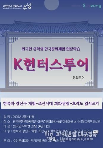 파이낸셜대구경북 김유신 기자 | 대구 수성문화재단은 올해 2월부터 11월까지 대구·경북 외국인 유학생을 대상으로 한국문화체험 현장학습 ‘K헌터스 투어’를 운영한다.