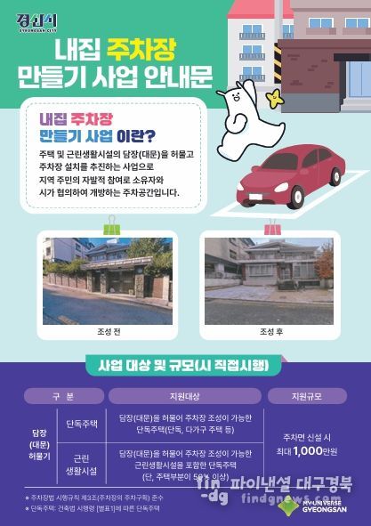 파이낸셜대구경북 기자 | 경산시는 주택 밀집 지역의 주차난을 해소하고 쾌적한 주거환경을 조성하기 위해 '2026년 내 집 주차장 만들기 시범 사업'을 추진하고 27일까지 신청을 받는다.