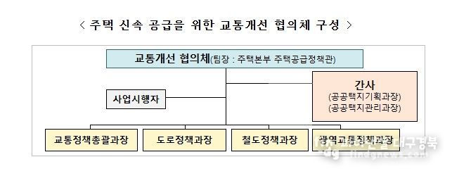 협의체는 주택공급추진본부 주택공급정책관을 팀장으로 교통정책총괄과장, 도로정책과장, 철도정책과장, 광역교통정책과장으로 구성되며, 주택공급 대상지와 관련하여 도로·철도·대중교통 등 교통 전반에 관련한 개선방안을 종합적으로 검토할 계획이다.