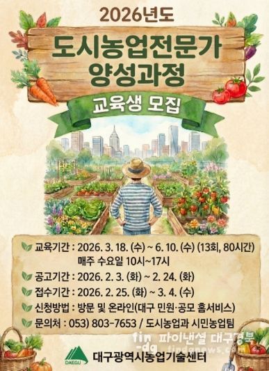 파이낸셜대구경북 김유신 기자 | 대구광역시농업기술센터는 단순한 농사 기술 습득을 넘어 도시 생태계 보전과 정서 함양 등 도시농업을 선도할 시민을 대상으로 ‘2026년도 도시농업전문가 양성과정’을 운영한다.