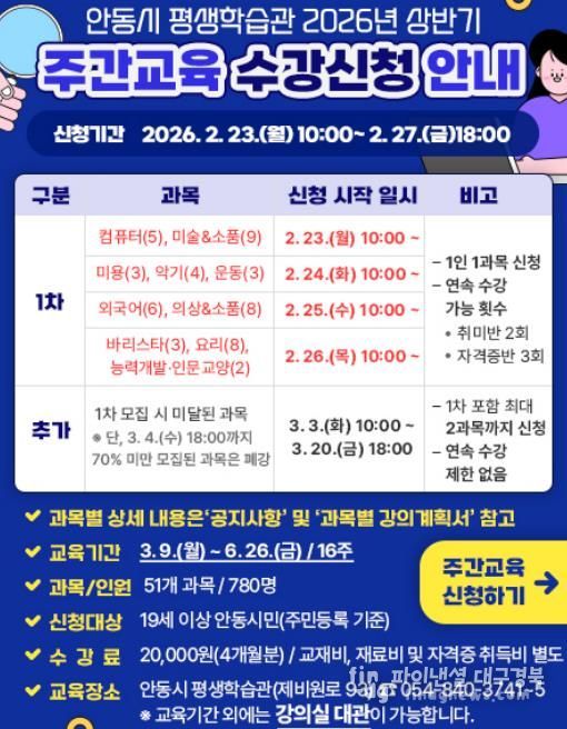 파이낸셜대구경북 기자 | 안동시 평생학습관은 오는 2월 23일부터 2026년 상반기 주간교육 수강생을 모집한다. 교육은 3월 9일부터 6월 26일까지 4개월간 진행되며, 총 51개 강좌에서 780명을 모집한다.