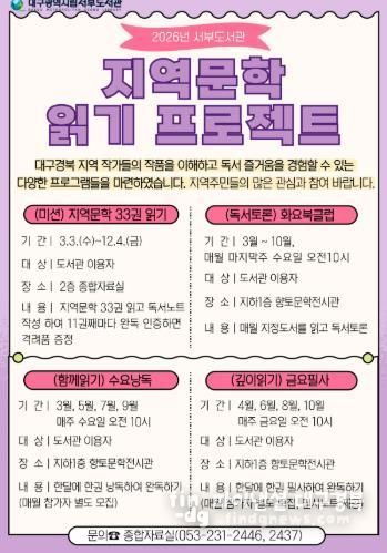 파이낸셜대구경북 김유신 기자 | 대구시교육청 서부도서관은 대구시민에게 지역 문인과 문학을 알리고 책 읽기의 즐거움을 경험할 수 있도록‘지역문학 읽기 프로젝트’를 3월부터 운영한다.