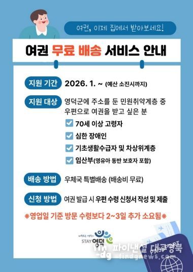 파이낸셜대구경북 기자 | 영덕군은 민원 취약계층의 행정 접근성을 높이고 주민 편의를 증진하기 위해 올해부터 ‘여권 무료 배송서비스’를 시행하고 있다.