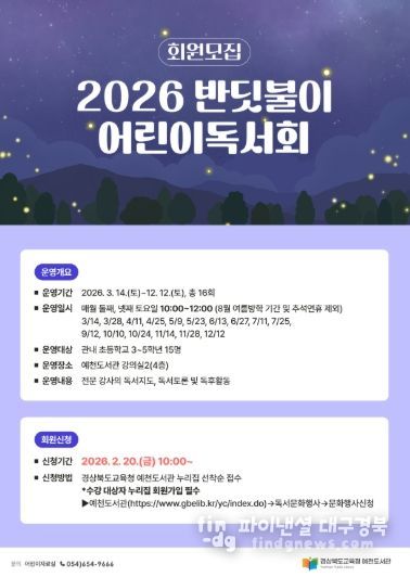 파이낸셜대구경북 기자 | 경상북도교육청 예천도서관은 이달 2월 20일부터 예천군 관내 초등학교 3~5학년을 대상으로 2026년 반딧불이 독서회원을 모집한다.