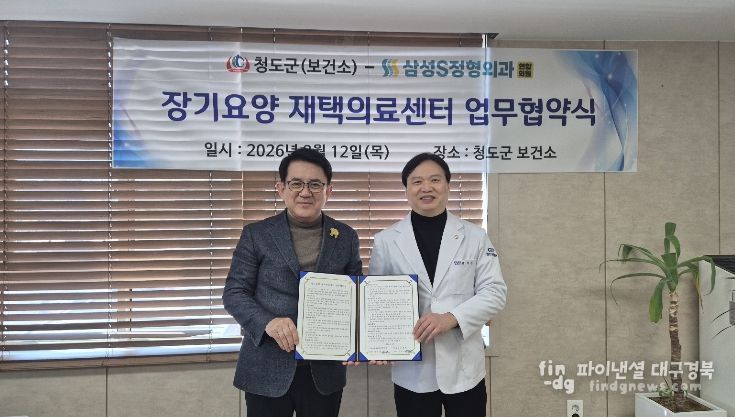 파이낸셜대구경북 기자 | 청도군은 2월 12일 청도삼성S정형외과연합의원(원장 김기영)을 장기요양 재택의료센터 의료기관으로 지정하고 업무추진을 위한 협약(MOU)을 체결했다. 이번 협약은 3월 27일부터 시행되는 의료·요양·돌봄 통합지원사업에 맞춰, 의료와 돌봄이 연계되는 민간의료기관-보건소간의 협업형 모델을 실현하기 위해 마련됐다.