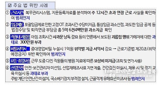 이와 함께 연장·야간·휴일근로 수당 등 임금 미지급 5억 6천4백만원에 대해서도 시정지시했다.