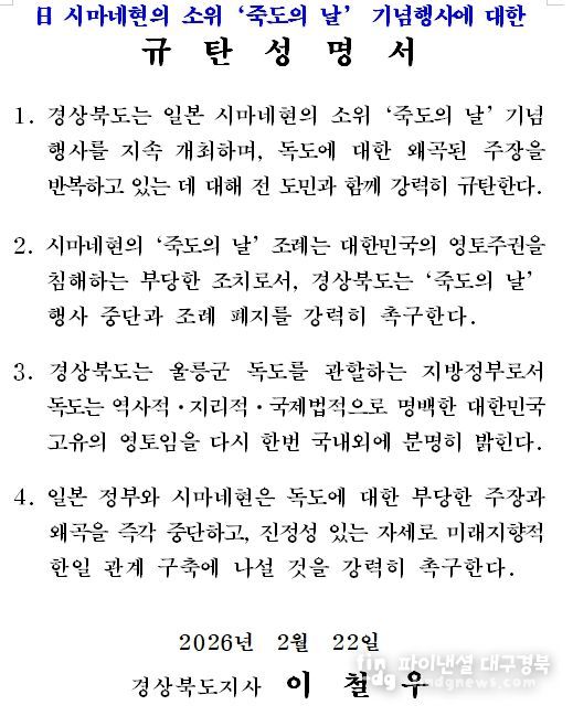 파이낸셜대구경북 김유신 기자 | 경상북도는 22일, 일본 시마네현이 소위 ‘죽도의 날’ 행사 개최에 대해 강력히 규탄하며, 행사 즉각 중단과 관련 조례 폐지를 촉구했다.