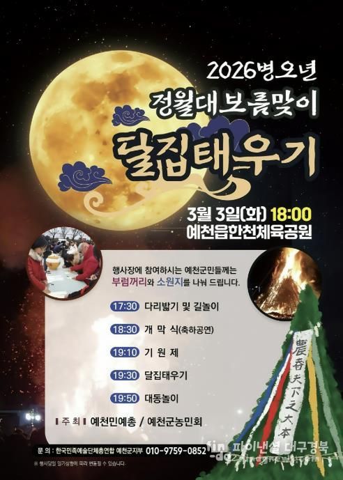 파이낸셜대구경북 기자 | 예천군은 오는 3월 3일 오후 5시 30분에 예천읍 한천체육공원에서 ‘2026년 병오년 정월대보름 달집태우기 행사’를 개최한다고 밝혔다.
