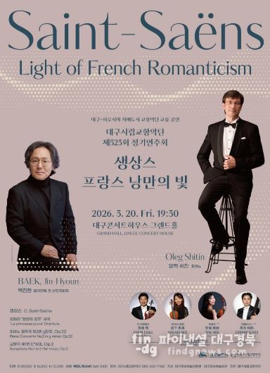 파이낸셜대구경북 김유신 기자 | 프랑스 낭만 음악의 거장 카미유 생상스(Camille Saint-Saëns, 1835~1921)의 오페라 서곡과 피아노 협주곡, 교향곡을 한 무대에서 만나는 대구시립교향악단(이하 대구시향) '제523회 정기연주회'가 오는 3월 20일 오후 7시 30분, 대구콘서트하우스 그랜드홀에서 열린다.