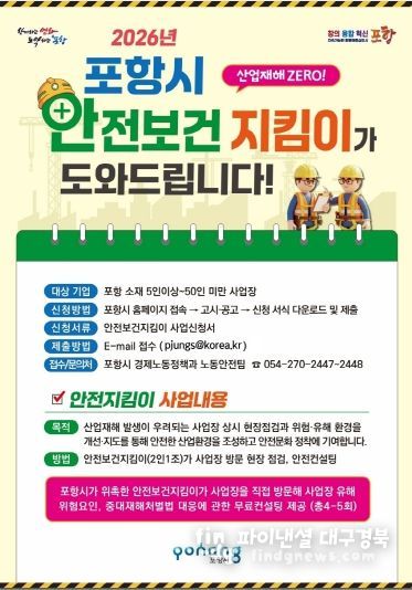 파이낸셜대구경북 기자 | 포항시는 지역 소규모 사업장의 산업재해를 예방하고 자율적인 안전관리 체계를 구축하기 위해 ‘2026년 안전보건지킴이 지원사업’ 참여 사업장을 모집한다.