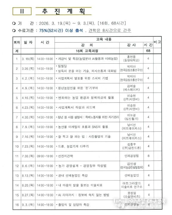 이번 청년농업인과정은 3월 19일 개강식을 시작으로 9월 3일까지 총 16회에 걸쳐 운영될예정이며 특히 변화하는 농업 환경에 발맞추어 청년농업인들이 현장에서 필요로 하는실질적인 지식과 기술을 전달하고 농촌의 안정적인 정착을 도모할 수 있는 다양한프로그램이 마련되어 기대를 모으고 있다.