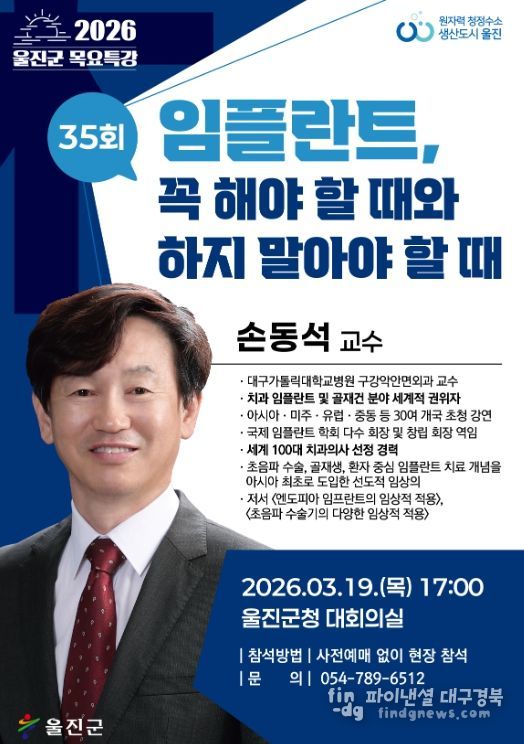 파이낸셜대구경북 기자 | 울진군은 오는 3월 19일 오후 5시 울진군청 대회의실에서 손동석 교수를 초청해‘임플란트, 꼭 해야 할 때와 하지 말아야 할 때’를 주제로 제35회이자 2026년 첫 목요특강을 개최한다.