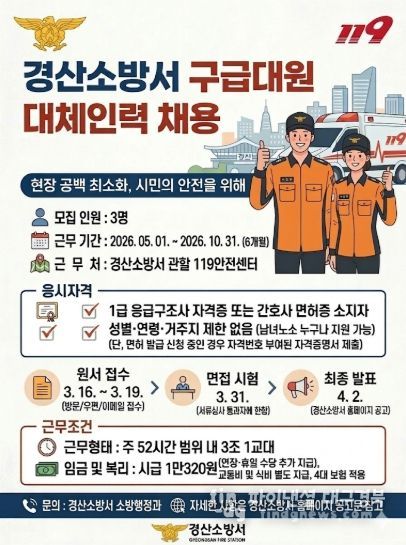 경상북도 경산소방서는 구급현장활동을 지원할 구급대원 대체인력(기간제근로자) 3명을 채용한다고 13일 밝혔다. 채용 인력은 오는 5월 1일부터 10월 31일까지 약 6개월간 경산소방서 관할 119안전센터에 배치돼 구급현장활동 보조 등 구급업무를 수행하게 된다.
