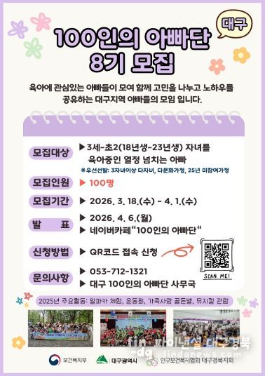 파이낸셜대구경북 김유신 기자 | 대구광역시는 아빠들의 적극적인 육아 참여를 독려하고 함께 육아하는 사회 분위기를 확산하기 위해 3월 18일부터 ‘2026년 제8기 대구 100인의 아빠단’ 활동 단원을 모집한다.
