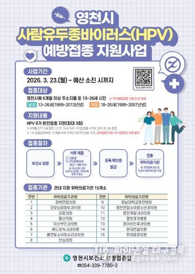 파이낸셜대구경북 기자 | 영천시는 오는 23일부터 영천시에 6개월 이상 주소지를 둔 13~26세 시민을 대상으로 사람유두종바이러스(HPV) 예방접종을 확대 시행한다고 밝혔다.