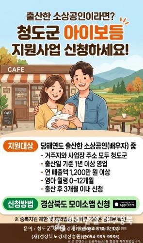 파이낸셜대구경북 김유신 기자 | 청도군은 출산으로 인한 소상공인의 경영 공백을 줄이고 안정적인 영업활동을 지원하기 위해 “2026년 소상공인 아이보듬 지원사업”을 추진한다고 밝혔다.