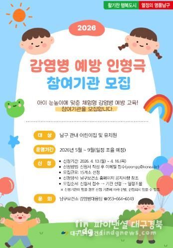파이낸셜대구경북 김유신 기자 | 대구 남구보건소는 '2026년 수요자 맞춤형 찾아가는 감염병 예방 교육'의 일환으로 어린이의 눈높이에 맞춘 감염병 예방 교육을 위해 ‘어린이 감염병 예방 인형극’ 참여기관을 4월 13일부터 4월 16일까지 모집한다.