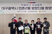 파이낸셜대구경북 김유신 기자 | 대구 수성구 만촌2동 주민자치위원회는 지난 8일 자매도시인 의성군 춘산면을 방문해 양 지역 간 우호 협력 강화를 위한 교류 활동을 진행했다. 이번 방문은 2023년부터 이어온 양 지역의 자매결연을 기반으로 주민자치 중심의 상생협력을 확대하기 위해 마련된 것으로, 주민자치위원과 12개 협력 단체 회원 등 30여 명이 참석했다. 방문단은 지난달 개소한 춘산어울림공간에서 공식 환영 행사와 시설 관람을 진행하며 교류의 의미를 나눴고, 향후 협력 확대 방안도 함께 논의했다. 또한 양 지역의 특색을 담은 기념품 교환도 이뤄졌다. 만촌2동은 수성구 대표 캐릭터 ‘뚜비’ 인형과 지역 전통주 ‘느지골 오양주’를 전달했으며, 춘산면은 목재문화체험장에서 제작한 냄비 받침과 금성농협 압맥을 선물하며 따뜻한 환대의 뜻을 전했다. 박영환 주민자치위원장은 “2023년부터 이어온 두 지역의 인연이 해를 거듭할수록 더욱 깊어지고 있어 뜻깊다”며 “앞으로도 주민 중심의 실질적 상생협력이 지속될 수 있도록 적극적인 교류 활동을 이어가겠다”고 말했다. 만촌2동과 춘산면은 앞으로