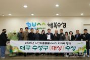 파이낸셜대구경북 김유신 기자 | 대구 수성구는 보건복지부가 실시한 2025년 ‘노인맞춤돌봄서비스 지자체 평가’에서 대상을 수상하며 ‘돌봄 공백 없는 어르신 행복 도시’의 위상을 입증했다. 수성구는 전국 229개 시군구를 대상으로 진행된 이번 평가에서 노인맞춤돌봄서비스 사업 추진 성과 전국 1위를 달성해 보건복지부 장관 기관 표창과 포상금 1,200만 원을 받았다고 밝혔다. 이번 평가는 △노인맞춤돌봄서비스 운영관리 △서비스관리(지역사회 유관 기관 네트워크 체계) △사업 성과 등 정량·정성 지표를 종합적으로 심사해 이뤄졌다. 수성구는 권역 책임제 기반의 전달체계 구축, 민관협력 네트워크, 현장 밀착형 성과관리 등을 통해 연속 돌봄 모델을 안정적으로 구현한 점이 높은 평가를 받았다. 수성구는 찾아가는 홀몸 어르신 전수조사로 신규·위기 대상자를 선제적으로 발굴하고, 유관 기관 네트워크 및 권역별 민관협의체 운영을 통해 기관 간 상호 의뢰·연계 체계를 마련했다. 또한 다양한 특화사업과 스마트 기술을 활용한 인공지능(AI)·사물 인터넷(IoT) 기반 안부·건강관리 등 예방 중심 돌봄서비스를 추진해