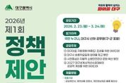 파이낸셜대구경북 김유신 기자 | 대구광역시는 전 국민과 시 산하 공무원의 창의적인 정책 아이디어를 발굴해 시정 발전의 동력으로 활용하고자 ‘2026년 제1회 정책제안 공모’를 개최한다. 이번 공모는 총 4개 분야를 주제로 진행된다. ▲대구 대표 지방정원(하중도) 조성을 위한 아이디어 ▲ 대구시 승용차요일제 참여율 제고 방안 ▲시민 중심의 자발적 소방안전관리 문화 확산 방안 ▲2027 대구세계사격선수권대회의 성공 개최 방안이다. 공모 기간은 2월 23일부터 3월 24일까지 30일간이며, 대한민국 국민이라면 누구나 참여할 수 있다. 제안은 대구시 온라인 참여 플랫폼 ‘토크대구’, 국민신문고, 우편, 방문, 팩스 등을 통해 접수 가능하며, 자세한 사항은 대구시청 홈페이지 공고 게시판에서 확인하면 된다. 접수된 제안은 업무 담당부서에서 창의성과 실시 가능성 등을 기준으로 채택 여부를 사전 검토하고, 이후 제안실무위원회 심의를 거쳐 우수 제안 후보를 선정한다. 선정된 후보에 대해서는 5월 초 시민이 직접 참여하는 온라인 투표 점수(30%)와 전문가로 구성된 제안심사위원회 심사 점수(70%)를