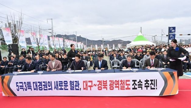 파이낸셜대구경북 기자 | 김천역 광장에서 27일 남부내륙철도‘김천역 선상역사 신축 기념식’이 열렸다. 이날 행사에는 이철우 도지사, 송언석 국회의원, 배낙호 시장, 경북도의회 지역 도의원과 주민 등 150여 명이 참석했다. 남부내륙철도의 일환으로 시행하는 김천역 선상역사는 연면적 3,500㎡, 3층 규모의 신축 건물로 총사업비 327억 원을 투입해, 11월 실시설계가 완료되면 2027년 하반기에 착공 예정이다. 선상역사가 새롭게 신축되고 문경~김천 철도가 개통되면, 김천역은 그동안 KTX가 운행되지 않아 김천역에서 서울까지 2시간 30분이 소요됐으나 1시간 10분으로 단축되고, 거제까지는 1시간 30분이면 이동이 가능해진다. 향후 김천역은 경부선, 경북선과 더불어 남부내륙선, 문경~김천 철도, 대경선이 연계되면서 복수 노선이 만나는 철도교통 거점 역할을 수행할 것으로 보인다. 선상역사는 단순한 역사(驛舍)가 아니라, 김천의 경제와 도시 발전을 이끄는 핵심인프라로 기존 철도가 가로막고 있던 구도심과 신도심을 자연스럽게 연결하여 철도로 단절된 지역 간 접근성이 개선돼 상권 회복 효과가 기대된다. &n