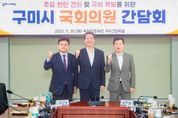 파이낸셜대구경북 금교광 기자 | 구미시는 9월 30일 국회를 방문해 구자근, 강명구 지역구 국회의원과 간담회를 열고 지역 주요 현안과 국비 확보 전략을 논의했다. 이날 간담회에는 김장호 시장을 비롯해 구미시 주요 간부 공무원 등 30여 명이 참석했다. 시는 현안 사업 추진 상황과 정부 예산 동향을 공유하며 국회 차원의 전략적 지원 방안을 모색했다. 주요 현안사업으로는 △구미국가산업단지 1~3단지 연결교량 신설 △구미~신공항 철도건설 △대한민국역사박물관(구미산업화역사관) 건립 △새마을운동중앙회 및 연수원 유치 △'5극 3특'국가균형성장 전략 대응 △한국은행 구미지역본부 유치 △'방위산업 소재ㆍ부품ㆍ장비 특화단지'유치 △국가 푸드테크 클러스터 조성 등이 논의됐다. 주요 국비사업으로 △구미시 제조창업 인큐베이팅 센터 구축 △AX 실증산단 구축 사업 △지역 주력 중소기업형 인공지능 데이터 스페이스 구축 △차세대 디스플레이 핵심부품ㆍ소재 기술개발 △반도체 장비 챔버용 소재부품 제조 및 검증 테스트베드 구축 △수요확대형 배터리 테스트베드 구축 △구미 산동 국민체육센터 조성 △푸드테크 연구지원센터 구축 △펫테크 산업화 지원센터 구축 △