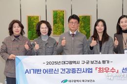파이낸셜대구경북 김유신 기자 | 대구 북구보건소는 대구시가 주관한 '2025년 AI기반 어르신건강증진 사업 평가'에서 ‘최우수기관’으로 선정됐다. 이번 평가는 대구 9개 구·군을 대상으로, △사업 목적에 부합한 대상자 선정과 홍보, △서비스 완료 노력, △참여자 건강개선 노력, △보건·복지 유관기관과의 네트워크 구축 및 연계·협력 수준 등 전반적인 사업 수행 역량을 종합적으로 심사하여 각 기관의 디지털 기반 어르신 건강관리 수준을 평가한 것이다. 북구보건소는 지역 소상공인·북구정신건강복지센터·재가노인돌봄센터·대구대학교 등과의 민·관·학 협력 모델을 안정적으로 정착시켜, 대상자 발굴부터 교육 기회 제공과 현장체험 및 실습공간 마련까지 전 과정의 협력체계를 구축하여 허약유지율·신체활동·식생활 개선 등 핵심 건강지표의 뚜렷한 향상을 이뤄내는 높은 평가를 받았다. 북구보건소는 “어르신 대상 비대면 건강서비스 확대에 지속적으로 노력한 결과가 이번 평가에서 높게 인정됐다”라고 밝혔다. 배광식 북구청장은 “앞으로도 어르신이 더 건강하고 안전한 삶을 누릴 수 있도록 실질적 변화를 이끄는 건강서비스와 지역 연계