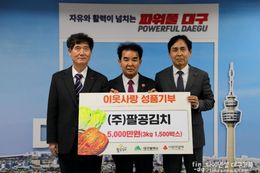 파이낸셜대구경북 김유신 기자 | 영농조합법인 팔공김치(대표 김태종)는 1월 13일 대구광역시청에서 병오년 새해를 맞아 어려운 이웃들과 따뜻한 정을 나누기 위해 5천만 원 상당의 팔공산명품김치(배추김치) 1,500박스를 대구사회복지공동모금회에 전달했다. 대구시와 대구사회복지공동모금회는 팔공김치로부터 기탁받은 배추김치를 ‘푸드뱅크’를 통해 지역 내 저소득 가구에 배부할 예정이다. 2008년 설립된 영농조합법인 팔공김치는 지역 대표 김치 제조업체로, 기부된 팔공산명품김치는 대구시가 품질을 인증한 ‘대구우수식품 제1호’ 인증을 받은 제품이다. 우수식품 인증 이후 온라인 유통 채널을 중심으로 매출이 급성장 중이며, 2024년 하와이를 시작으로 호주, 미국 LA 등으로 수출을 확대하며 수출국 다변화에도 힘쓰고 있다. 이재홍 대구광역시 보건복지국장은 “어려운 이웃들을 위해 꾸준히 기부 활동을 펼쳐온 영농조합법인 팔공김치에 깊은 감사를 표한다”며 “이번에 기탁된 배추김치는 어려운 이웃들에게 따뜻한 위로가 될 수 있도록 소중히 전달하겠다”고 말했다. [뉴스출처 : 대구시]