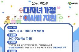 파이낸셜대구경북 김유신 기자 | 예천군은 다자녀 가정의 경제적 부담을 완화하고 안정적인 생활 정착을 돕기 위해 ‘2026년 다자녀 가정 이사비 지원 및 농수산물 쿠폰 지원사업’을 시행한다고 밝혔다. 이번 사업은 최근 양육비 및 생활비 부담이 커지는 가운데, 아이 키우기 좋은 환경을 조성해 저출생 문제를 극복하고자 추진한다. 먼저, 이사비 지원 사업은 이사와 관련된 비용을 최대 40만 원 한도 내에서 실비 지원하는 사업이다. 대상은 2026년 이후 예천군으로 전입하거나 관내에서 이사 후 전입신고를 완료한 가구 중 2024년 1월 이후 출생 자녀를 포함한 2자녀 이상 가구이며, 신청은 정부24 온라인 신청을 통해 가능하다. 이와 함께 시행되는 농수산물 구입 지원 사업은 부모 중 1명 이상이 예천군에 주소지를 두고, 2008년 1월 1일 이후 출생 자녀 1명을 포함해 2명 이상의 자녀가 경북에 주소지를 둔 가구를 대상으로 한다. 선정된 가구에는 자녀 수에 따라 경상북도 농특산물 쇼핑몰 ‘사이소’에서 사용할 수 있는 쿠폰을 지급하며, 신청은 경북 저출생 극복 통합 접수시스템 온라인 신청을 통해