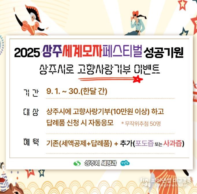 파이낸셜대구경북 이지원 기자 | 상주시는 9월 한 달 동안 2025 상주세계모자페스티벌의 성공 개최를 응원하고, 고향사랑기부제 홍보와 기부문화 조성을 위한 ‘상주시로 고향사랑기부 이벤트’를 진행한다.