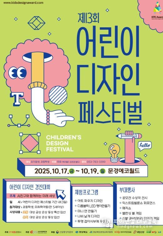 파이낸셜대구경북 기자 | 경상북도와 문경시가 주최하고 (사)디자인정책연구원이 주관하는 제13회 대한민국 어린이제품 디자인 공모전 ‘어린이 디자인 페스티벌’이 10월 17일부터 19일까지 사흘간 문경에코월드에서 열린다.