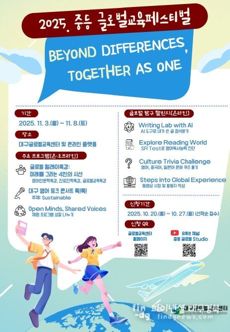 파이낸셜대구경북 김유신 기자 | 대구교육연수원 산하 대구글로벌교육센터는 11월 3일부터 8일까지 ‘Beyond Differences, Together as One(차이를 넘어, 하나로)’을 주제로 '2025 중등 글로벌교육페스티벌'을 개최한다.