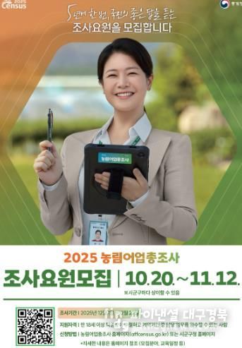 파이낸셜대구경북 김유신 기자 | 김천시는 오는 12월 1일부터(온라인 조사는 11월 20일부터) 실시되는 2025 농림어업총조사의 성공적 추진을 위해 조사원과 관리자 등 조사 인력을 모집한다.