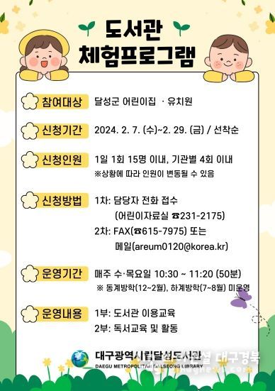 접수는 선착순으로 진행하며, 기타 자세한 사항은 달성도서관 어린이자료실로 문의하면 된다.