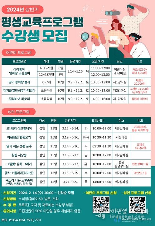 파이낸셜대구경북 신영숙 기자 | 경상북도교육청 의성도서관은 지역주민의 여가활용과 자기계발의 기회를 제공하기 위해 2월 14일부터 상반기 평생교육 프로그램 수강생을 모집한다고 밝혔다.