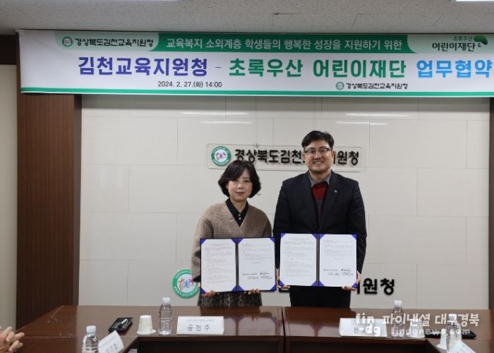 파이낸셜대구경북 신영숙 기자 | 김천교육지원청은 교육복지 소외계층 학생들의 발굴 및 지원체계 구축을 통해 학생들이 올바르고 행복하게 성장할 수 있도록 지원하기 위해 초록우산 어린이재단 경북지역본부(이하 “초록우산 어린이재단”, 본부장 문희영)와 업무 협약을 체결했다.