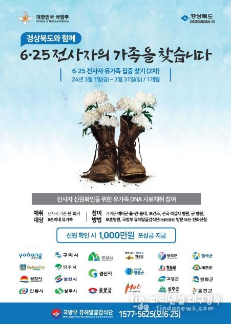 파이낸셜대구경북 강대산 기자 | 울진군은 3월 한달간 지역의 민(이장ㆍ단체 등)ㆍ관(군ㆍ10개 읍ㆍ면)ㆍ군(121여단 1대대)과 협업하여'6.25전사자 유가족 집중찾기(2차)'를 시행한다.