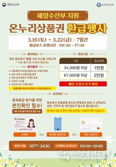 이번 행사는 경상북도 내 162개 인정(등록)시장 중 6개 시장(경산공설시장 포함)이 선정된 결과로 경산공설시장 및 중앙상점가 내 19개 대상 점포에서 국내산 수산물을 구매하면 구매자에게 최대 2만원의 온누리상품권을 지급하는 것이다. 34,000원 이상 67,000원 미만 구매 시 1만원, 67,000원 이상 구매 시 2만원을 온누리상품권(지류형)으로 환급받는 행사로 당일 구매 영수증을 경산공설시장 어물지구 1층(상인회사무실 옆) 환급처에 제시하면 된다. 또한 4월(4.13.~4.19.)은 하양꿈바우시장, 5월(5.4.~5.8.)은 경산공설시장에서 온누리상품권 환급행사가 예정돼 있다.