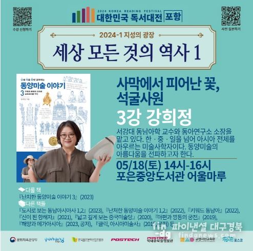 파이낸셜대구경북 이지원 기자 | 포항시는 18일 포항시립포은중앙도서관 어울마루에서 ‘2024 대한민국 독서대전 포항’ 연간프로그램인 세상 모든 것의 역사 3번째 시간인 ‘사막에서 피어난 희망의 꽃, 석굴사원’을 진행한다.
