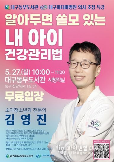파이낸셜대구경북 김유신 기자 | 대구동부도서관은 오는 5월 27일 오전 10시부터 대구동부도서관 시청각실(지하 1층)에서 대구파티마병원 의사 초청 특강 ‘알아두면 쓸모 있는 내 아이 건강 관리법’을 개최한다.