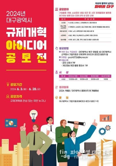 파이낸셜대구경북 김유신 기자 | 대구광역시는 경제활동과 일상생활에 불편을 주는 다양한 규제를 시민이 직접 제안하는 ‘2024년 대구광역시 규제개혁 아이디어 공모전’을 개최한다.