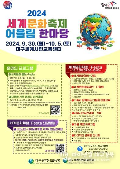 파이낸셜대구경북 김유신 기자 | 대구시교육청은 9월 30일부터 10월 5일까지 대구세계시민교육센터에서 ‘2024 세계문화축제 어울림 한마당’을 개최한다.